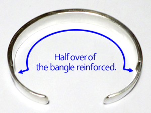 バングルの裏に銀板を貼る範囲はバングル全長に対し1/4で約4~6cm、1/3で約7~9cm、1/2で約10~13cm、ハーフオーバーで約13~15cm、フルカバーで全周を補強する大きく5種類の補強範囲があります。補強範囲が大きいほど強度も比例し折れにくくなります。バングルの全長により実際の補強範囲cmは前後します。